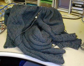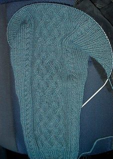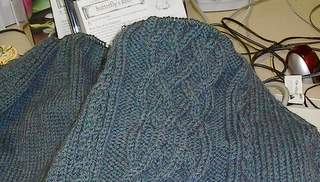 It really is starting to look like a sweater. If it’s a sweater that will fit me, that’s a whole different kettle of fish, but I have hopes. I should sew up the sides and try it on, but I’m chicken to know the awful truth. Even if it doesn’t fit me now, surely it will eventually, right? Here’s a bit of cable porn for the sleeve junkies.