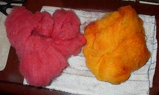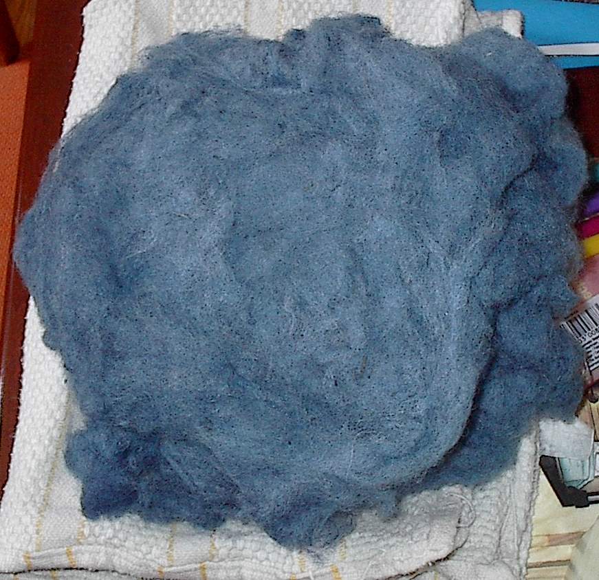 Sore arms, and still a deep blue dye bath. I was out of cotton things I wanted blue. I mean I like blue and all, but there is only so much blue cotton a girl needs. Especially a girl who is not currently knitting (much). So in a moment of ‘enh, what the hell’, I dumped a healthy glug glug glug of vinegar in it, had a moment of ‘I am so smrt'(1) with the ph measurement and tossed fleece in. Heated it up (wool likes being warm. And acidic.), let it cool and…
