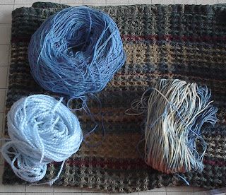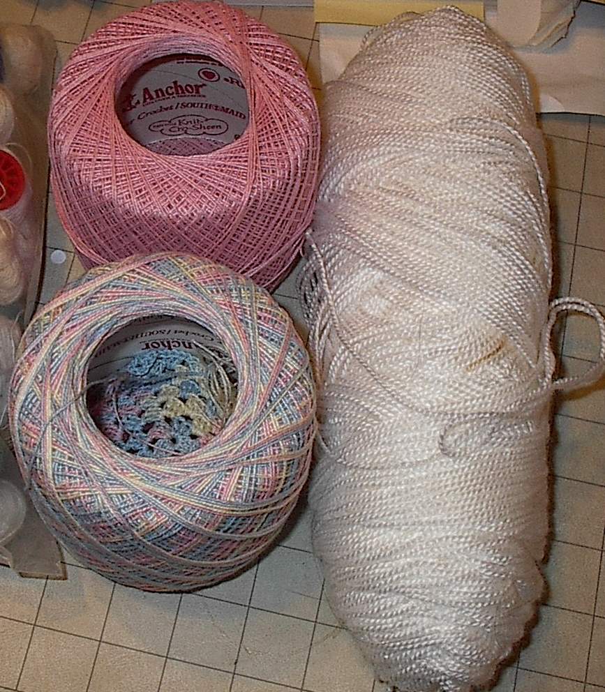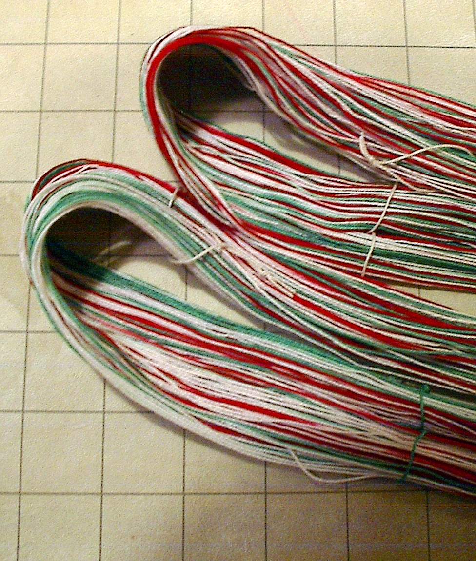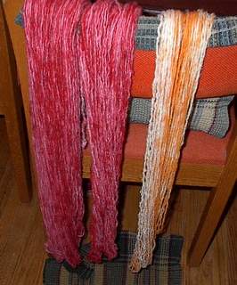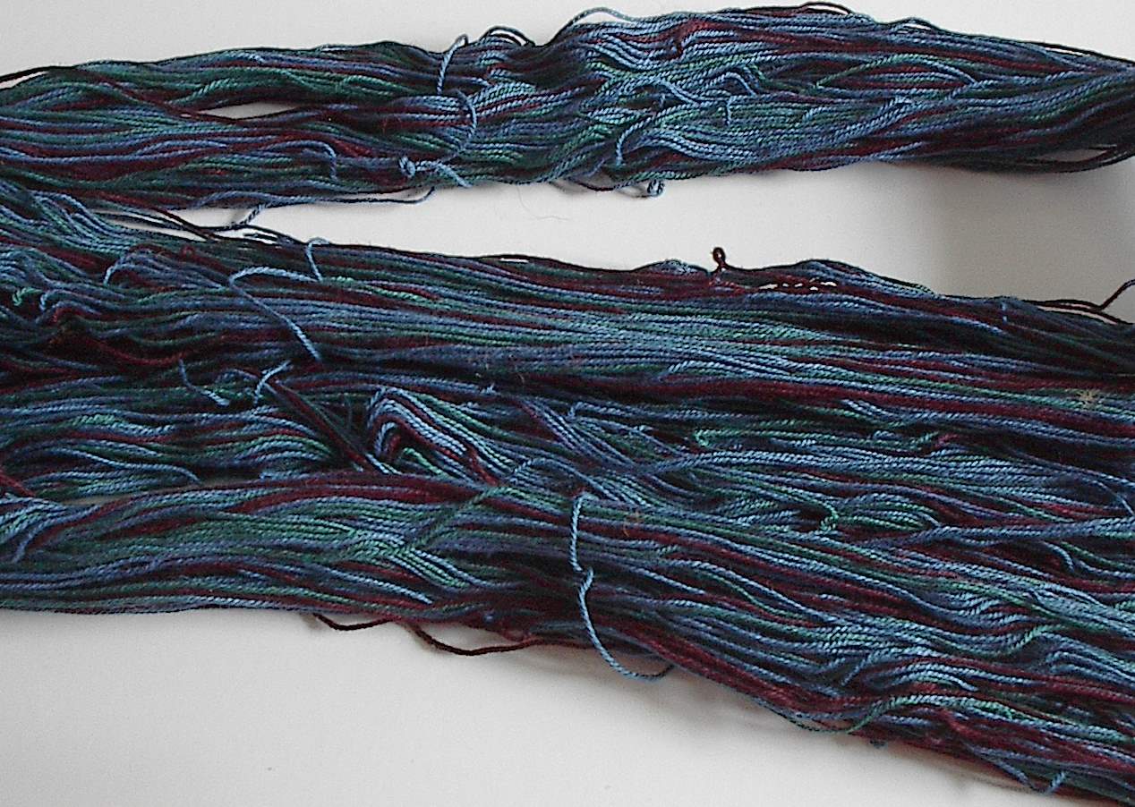 The big ball of white stuff is acrylic (I’m pretty sure) and I only balled off a wee sample that stained a little. The bizarre varigated on the bottom right came from a ball of ecru cotton still balled up tightly and thrown in for good measure. I decided not to skein off the ball of pink cotton, my arms were getting sore by then.