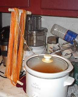 and some el cheapo cold water dye from the fabric store in blue and my trusty dye crock pot (turned off, we’re talking cold water dye here). Voila.