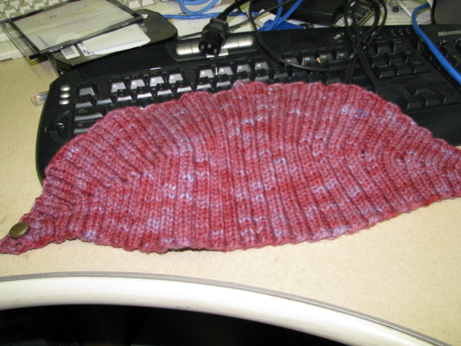 In hindsight, a tighter gauge would be better against the wind, and it’s a shade large. Apparently I have a small head, or something. Probably more accurate to remember that knits tend to stretch. If (when?) I knit another, I’ll probably drop down to 3.75 mm needles. Here, let me give you another photo of the fabric, so you can admire the dye job. (All this and modest too!)