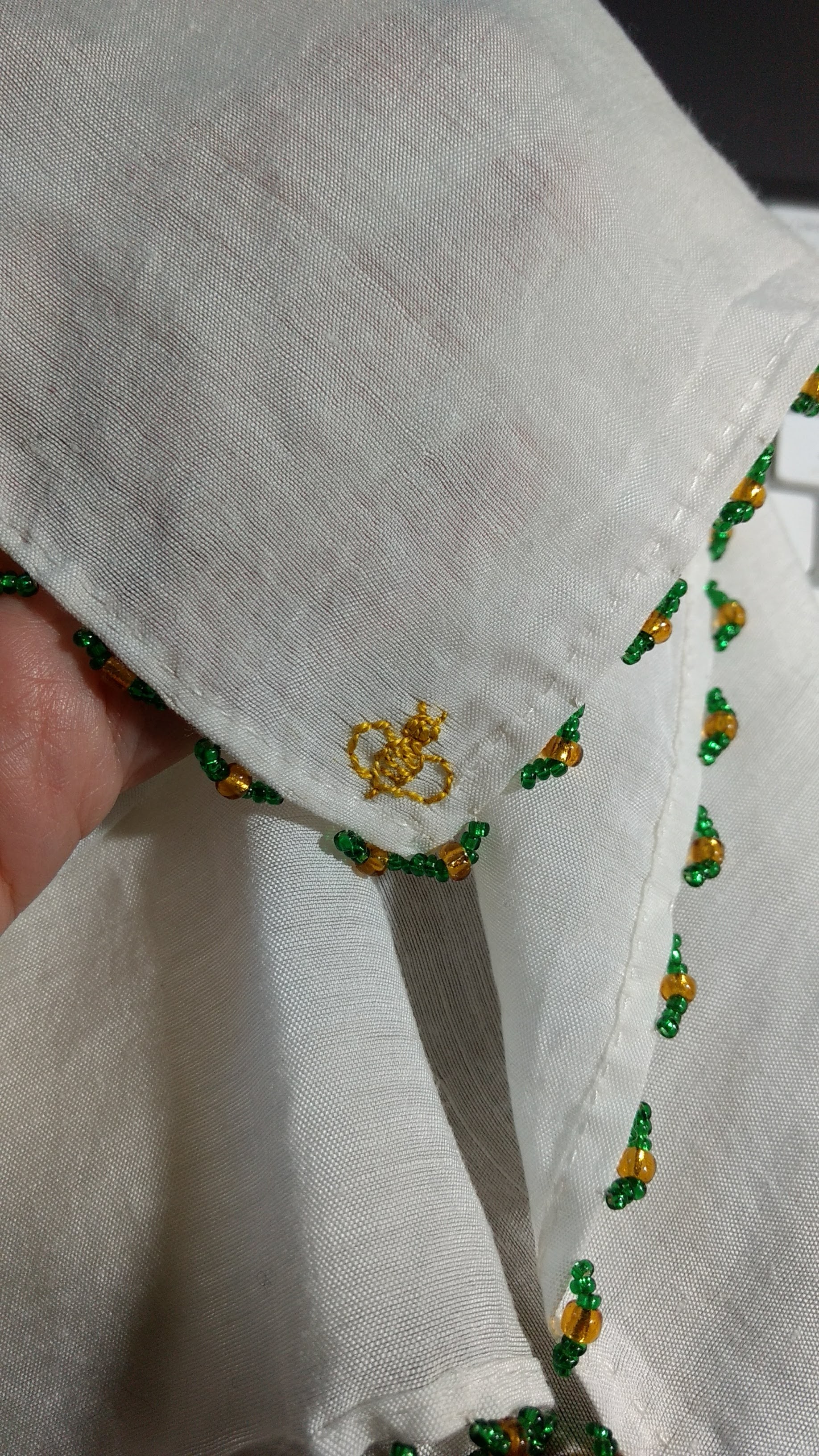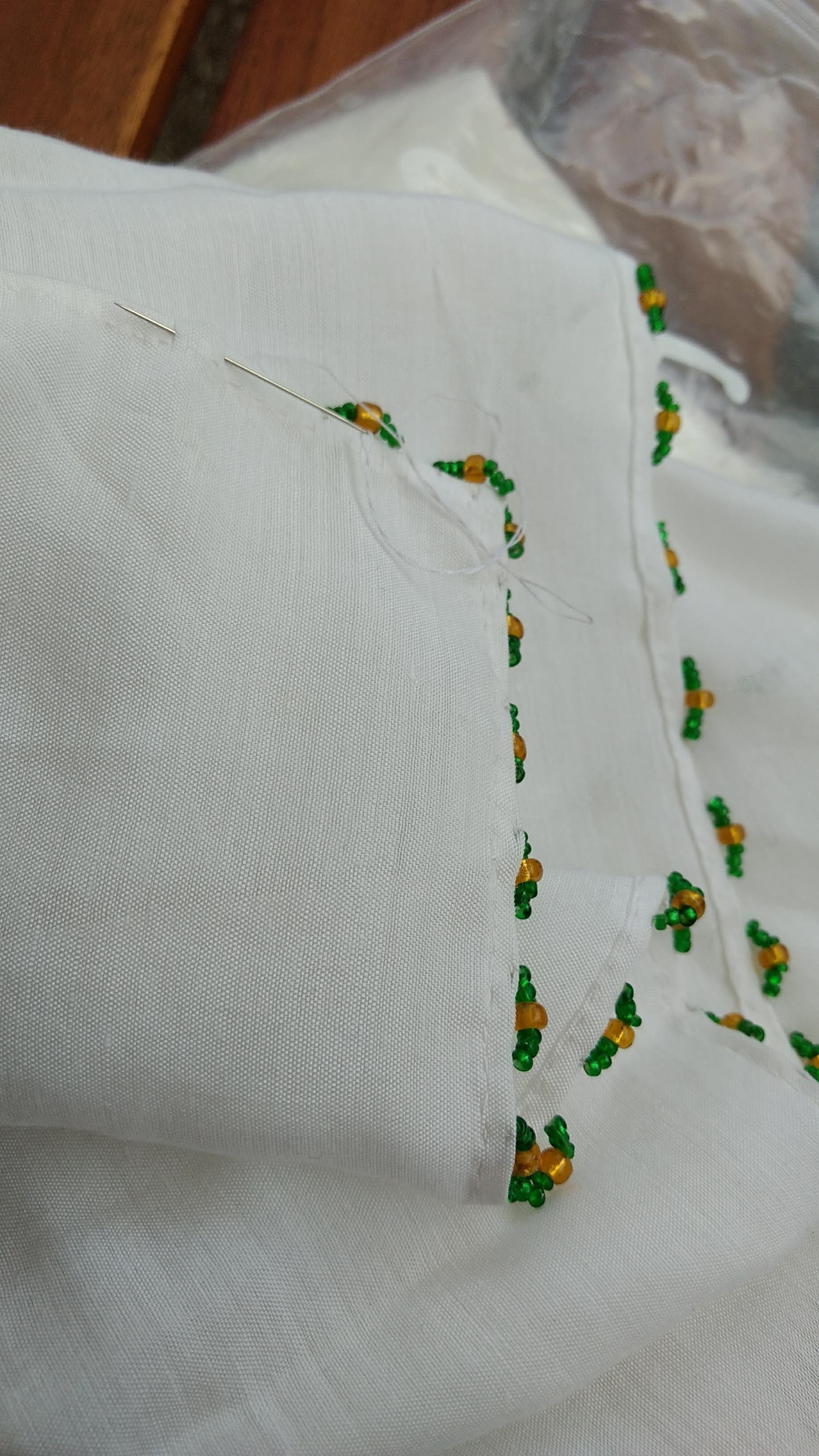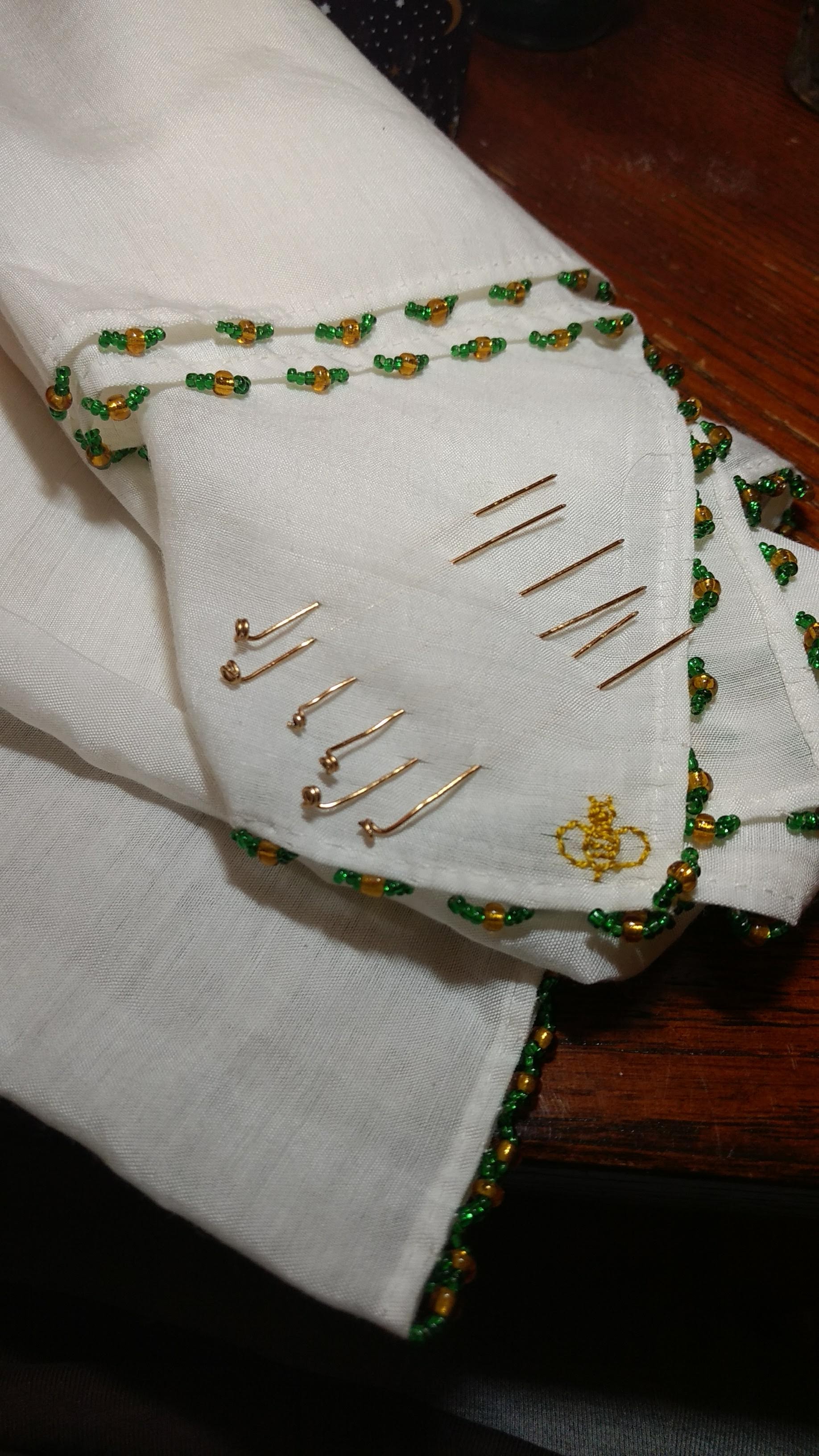 Mine looked a little more colourful, with green and gold glass beads (sewn on with silk thread).