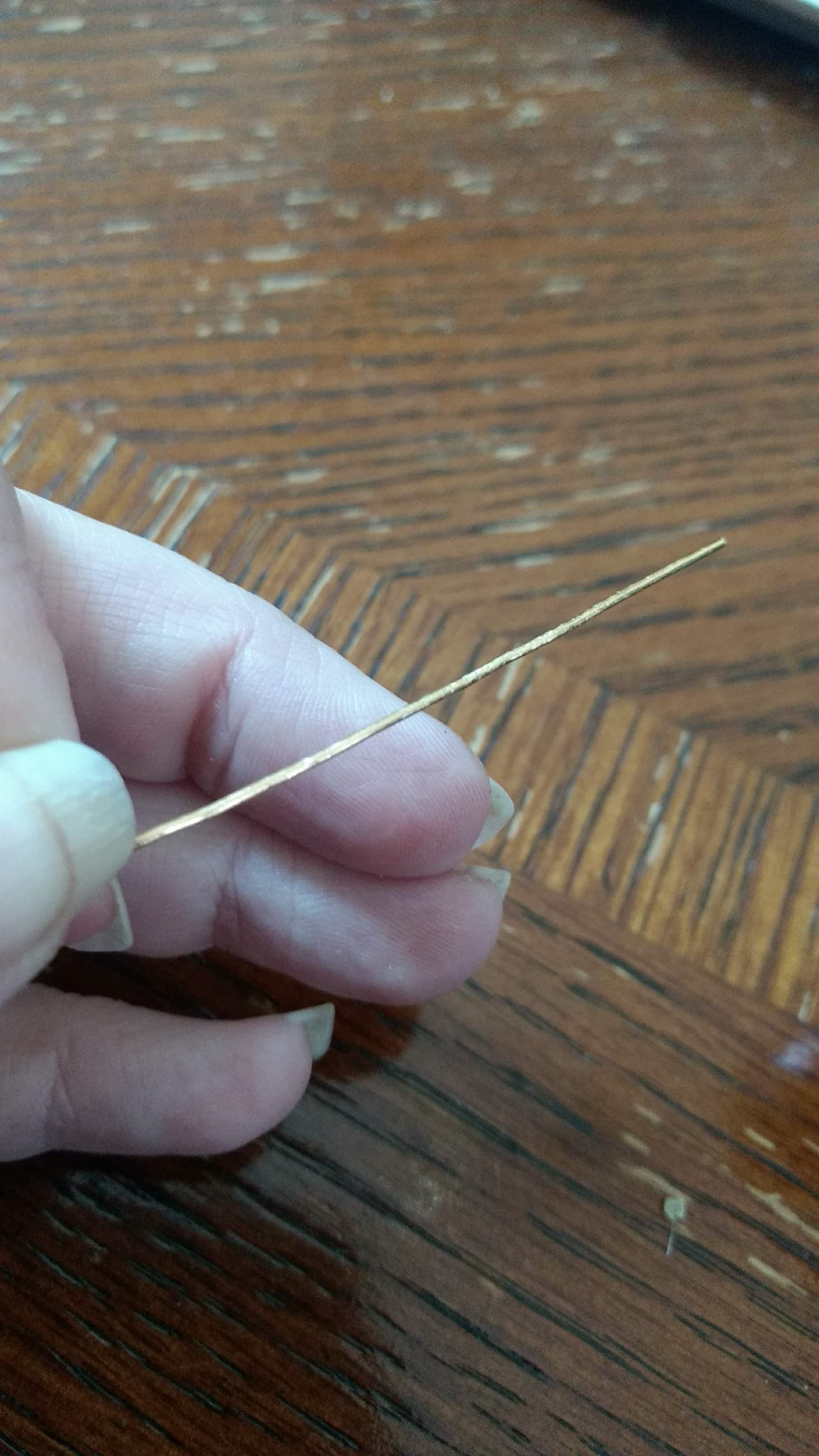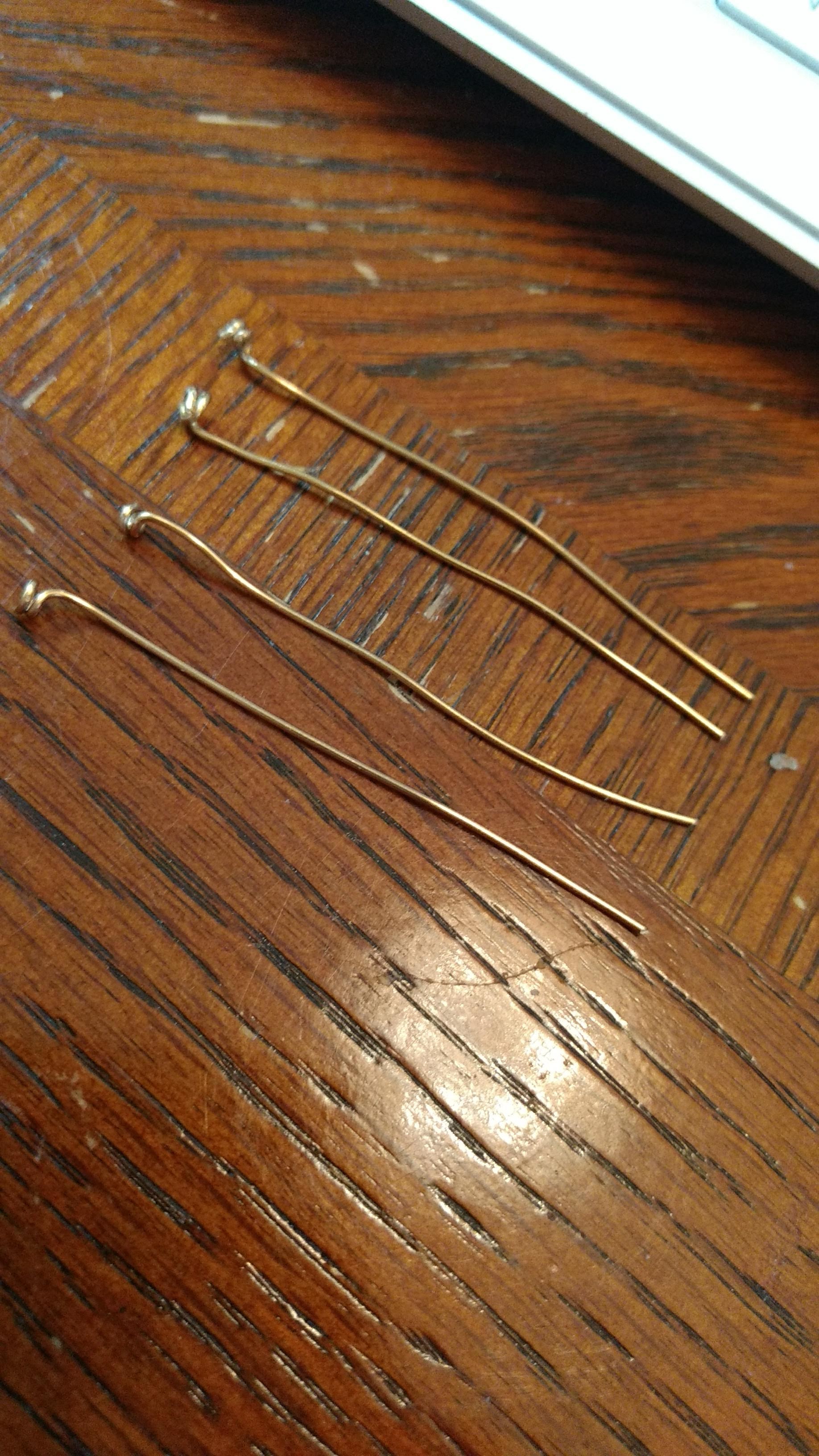 Once I got the veil done, I wanted to aim for the stretch goal.. so I decided to make some veil pins to go with. I do not work with metal. I play with string, but after consults with people who know far more than I (Thank you!), off I went to gather up brass wire and pliers and a hammer. A little wonky perhaps, but I learned about how to work harden metal, and file points onto my little pins and even a little wonky, I am chuffed to bits with these silly little things.