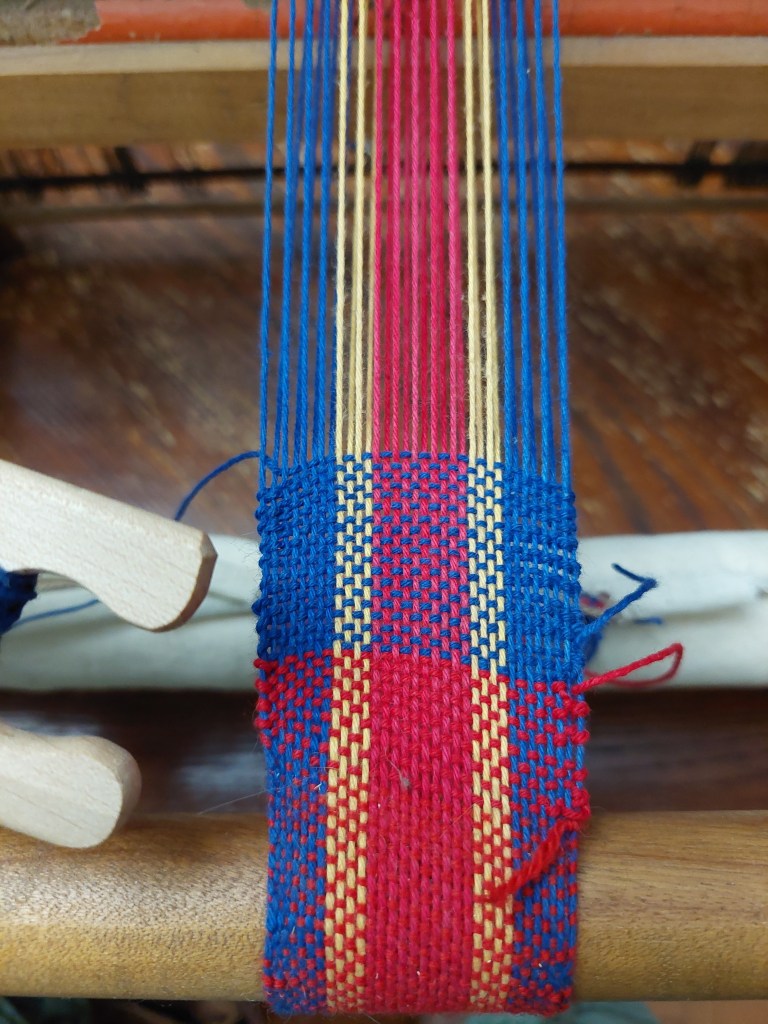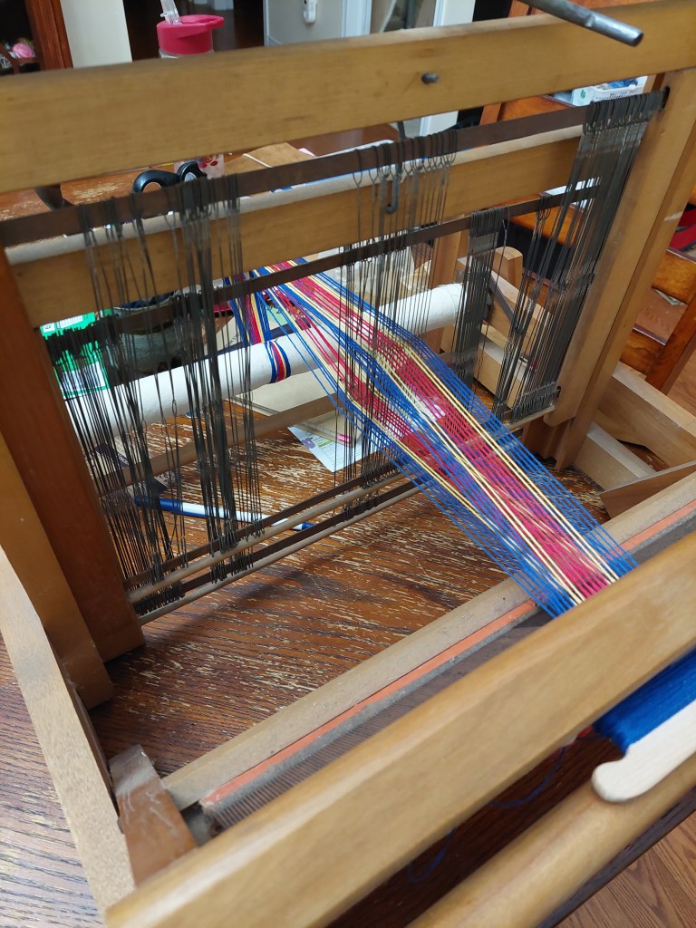 Two shaft is mostly limited to plain weave, and 14″ isn’t very wide, but I can confirm that she weaves up just fine. The shed isn’t big enough for a boat shuttle (there’s clearly a reason she shipped with a flat shuttle), but for the amount of cloth she can hold, a flat shuttle is just fine. I’m delighted to have added a third Leclerc loom to my collection!